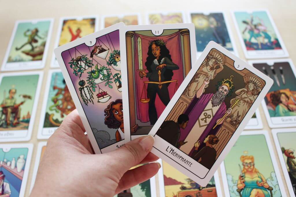J’adore ce jeu ! Il a vite pris une place importante dans mes tirages. Il revient très souvent dans mes favoris pour toutes sortes de demandes qu’elles soient professionnelle, sentimentale ou générale. Il a ce côté dépoussiéré du tarot qui me fait vibrer ors de mes séances. Finito le côté médiéval trop classique, on bouscule les codes dans ces 78 cartes et ça fait du bien.